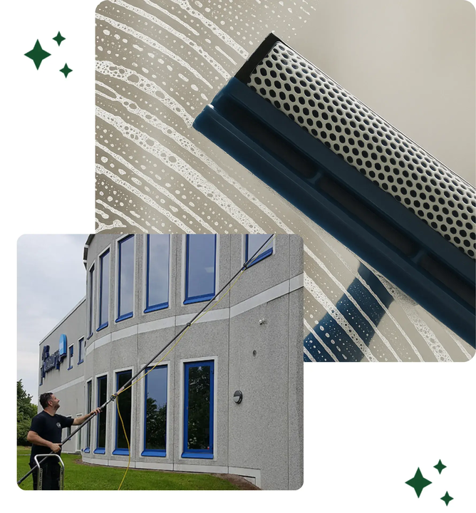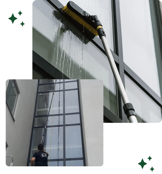 Vi använder oss utav ett miljövänligt system för att rengöra fönster ända upp till ca 20 meters höjd. Det innebär att vi tvättar fönster med ultrarent vatten vilket tar bort behovet av kemikalier och det ökar säkerheten i jobbet eftersom de flesta arbeten utförs nerifrån marken – utan stege eller dyra och tunga liftar på ett miljövänligt sätt. Det rena vattnet rengör fönster och solpaneler med hjälp av en munstycksförsedd borste (specialmaterial för rep fri rengöring). Det tar effektivt bort smutsen samtidigt som det inte blir några rinningar efter vattnet när det torkar.